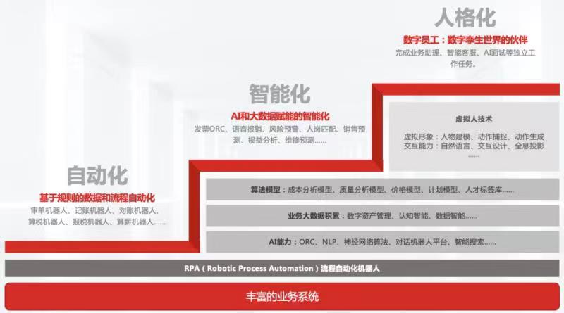 不同于閱讀、聊天、搜索等面向終端用戶的應(yīng)用場景,人工智能在企業(yè)級領(lǐng)域的應(yīng)用更具復(fù)雜性。在這一過程中,從早期依托RPA技術(shù)實現(xiàn)基于規(guī)則的數(shù)據(jù)和流程自動化,到借助OCR、NLP、算法模型等實現(xiàn)AI和大數(shù)據(jù)賦能的智能化,再到基于虛擬人技術(shù)的數(shù)智員工的誕生,AI技術(shù)在企業(yè)領(lǐng)域的應(yīng)用歷經(jīng)自動化、智能化、人格化的發(fā)展過程。