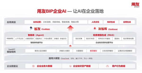 這一切并非偶然,用友BIP企業(yè)AI基于AIX數(shù)據(jù)X流程原生一體架構(gòu),提供從數(shù)據(jù)層、模型矩陣層、平臺層到應(yīng)用層的完整能力體系,在業(yè)務(wù)運營、人機(jī)交互、知識與應(yīng)用生成等多場景實現(xiàn)AI在企業(yè)的落地,全面賦能企業(yè)智能化升級。