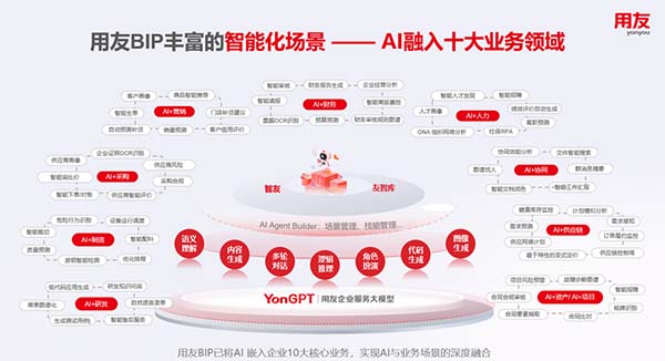 用友企業(yè)服務(wù)大模型YonGPT作為業(yè)界首個企業(yè)服務(wù)大模型,它融合了企業(yè)各個領(lǐng)域?qū)I(yè)知識和各類行業(yè)商業(yè)KnowHow,經(jīng)過領(lǐng)域、行業(yè)數(shù)據(jù)的預(yù)訓(xùn)練和精調(diào)的企業(yè)應(yīng)用服務(wù)的大模型,結(jié)合了用友在企業(yè)服務(wù)領(lǐng)域的經(jīng)驗積累、領(lǐng)先并場景豐富的企業(yè)應(yīng)用軟件產(chǎn)品、大規(guī)模企業(yè)客戶基礎(chǔ)的優(yōu)勢,能夠理解、解析各類企業(yè)數(shù)據(jù),應(yīng)用于各類業(yè)務(wù)場景。其面向復(fù)雜的行業(yè)應(yīng)用場景, 通過對行業(yè)模型精調(diào)幫助企業(yè)實現(xiàn)智能化的業(yè)務(wù)運營、自然化的人機(jī)交互、智慧化的知識生成、語義化的應(yīng)用生成四大能力,為企業(yè)提供智能化的人機(jī)協(xié)作、業(yè)務(wù)洞察、商業(yè)決策支持和智能運營服務(wù),是深懂業(yè)務(wù)的大模型,已完全融入到企業(yè)的“研供產(chǎn)銷服、人財物客項”業(yè)務(wù)與管理場景中。