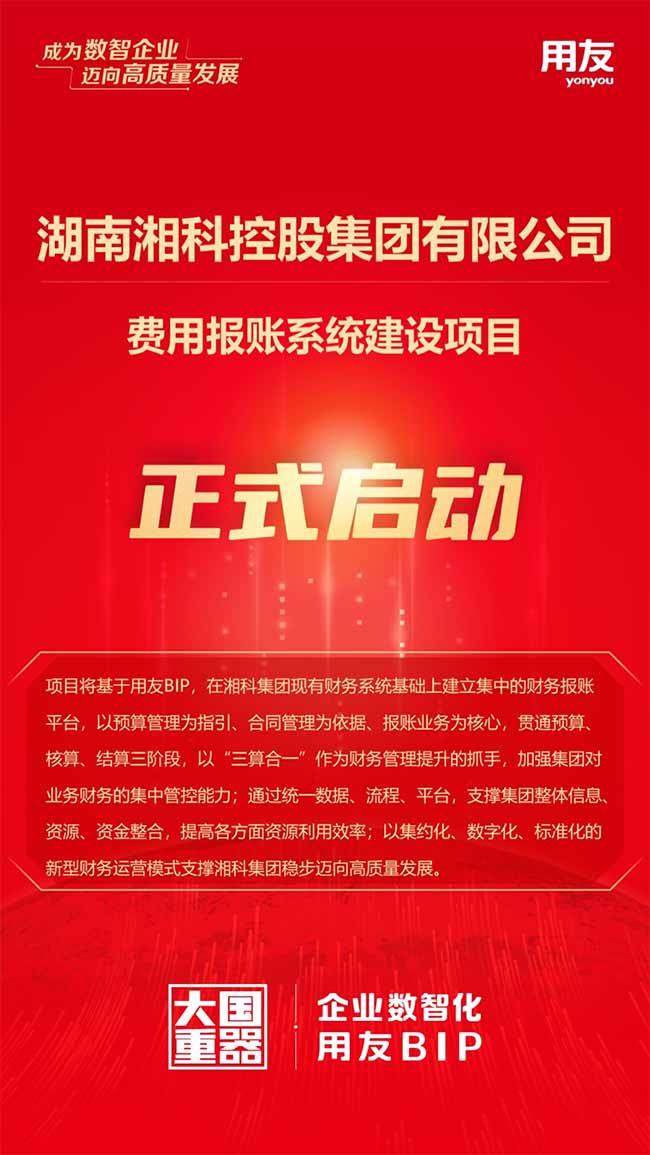 “十四五”時(shí)期是湘科集團(tuán)全面推動(dòng)高質(zhì)量發(fā)展的關(guān)鍵期。湘科集團(tuán)積極貫徹落實(shí)國(guó)務(wù)院、國(guó)資委提出的“加快推進(jìn)國(guó)有企業(yè)數(shù)字化轉(zhuǎn)型”要求,攜手用友開啟財(cái)務(wù)數(shù)智化建設(shè)新征程,以財(cái)務(wù)數(shù)智化牽引集團(tuán)整體數(shù)智化,支撐企業(yè)在新時(shí)期做優(yōu)做大做強(qiáng)。