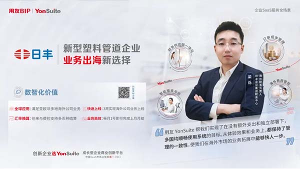 日豐集團自1996年成立以來,在管道產(chǎn)品領域深耕二十余載,為億萬家庭提供全屋管道系統(tǒng)解決方案。隨著品牌走向國際,其在海外業(yè)務運營協(xié)同和管理上面臨諸多挑戰(zhàn)。在此背景下,日豐選擇用友YonSuite作為海外拓展的數(shù)智化伙伴,取得了顯著成效:實現(xiàn)了更高效管理,極大提升了財務的工作效率和全球的協(xié)同效率,有力推動企業(yè)在全球業(yè)務的拓展。