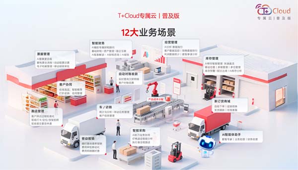 同時(shí),AI驅(qū)動(dòng)下,業(yè)財(cái)融合正從傳統(tǒng)的流程對(duì)接升級(jí)為“數(shù)據(jù)同源、規(guī)則共通、決策共生”的智能協(xié)同模式。T+Cloud專屬云普及版通過(guò)AI引擎重構(gòu)業(yè)務(wù)流程,讓12大智能場(chǎng)景成為業(yè)財(cái)數(shù)據(jù)的“雙向轉(zhuǎn)化樞紐”。