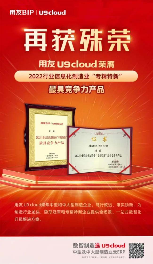 憑借在眾多制造企業(yè)的成功應(yīng)用,用友U9 cloud先后榮獲2022年中國制造業(yè)云ERP狀元獎、2022行業(yè)信息化制造業(yè)“專精特新”最具競爭力產(chǎn)品、2022新基建中型及中大型制造業(yè)云ERP首選品牌等一系列獎項,成為制造企業(yè)數(shù)智化轉(zhuǎn)型的首選品牌。