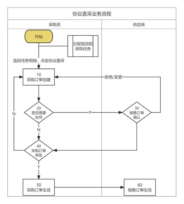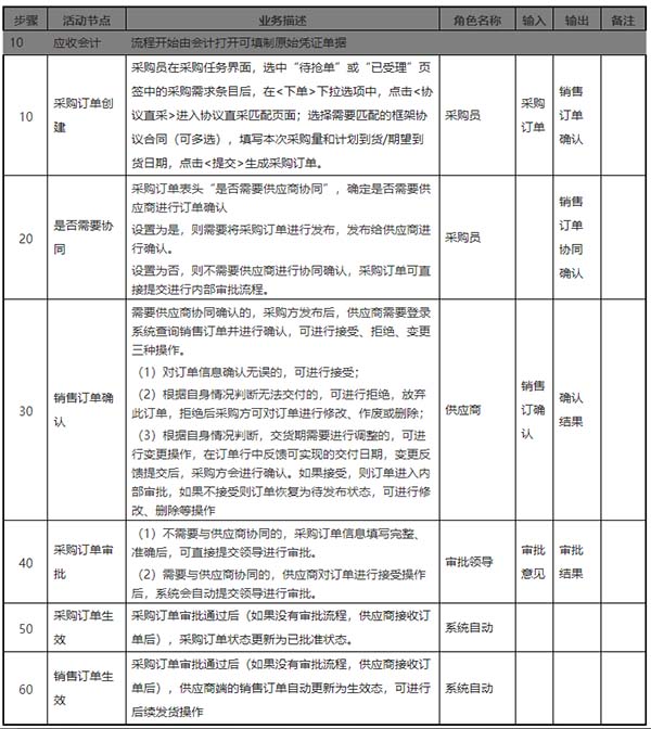 采購(gòu)后員接到采購(gòu)任務(wù),針對(duì)前期簽訂了采購(gòu)框架協(xié)議合同的物料,無(wú)需去做采購(gòu)詢(xún)價(jià),勾選采購(gòu)任務(wù)里的物料匹配到簽訂的框架協(xié)議合同(未到協(xié)議終止日期的采購(gòu)框架協(xié)議)匹配價(jià)格,確定本次采購(gòu)量和期望到貨日期生成采購(gòu)訂單,發(fā)布協(xié)同給到供應(yīng)商。供應(yīng)商查看并確認(rèn)訂單,自動(dòng)形成銷(xiāo)售訂單,供應(yīng)商根據(jù)訂單完成貨物交付發(fā)票開(kāi)具,采購(gòu)方完成貨物的簽收和入庫(kù)和款項(xiàng)支付后續(xù)業(yè)務(wù)。